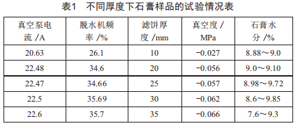 為此,漳電技術(shù)人員對脫硫石膏水分控制做了相關(guān)試驗,通過對不同厚度下石膏樣品的試驗比較(表1),脫水機濾餅厚度在30~35mm之間時,石膏含水量較少,平均在8.45%。