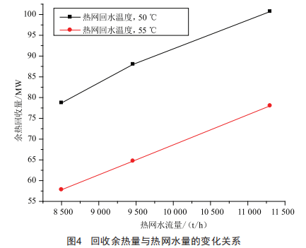 不同供熱工況,熱網(wǎng)回水溫度分別為55℃、50℃時(shí),回收余熱量與熱網(wǎng)水量間的變化關(guān)系如圖4所示。
