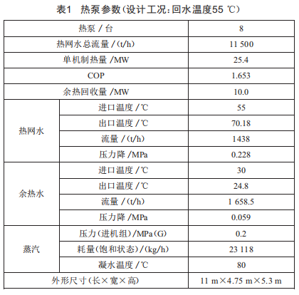 采用8臺(tái)單機(jī)制熱量為25.4Mw(回水溫度55℃)的溴化鋰吸收式熱泵。單臺(tái)溴化鋰吸收式熱泵機(jī)組額定設(shè)計(jì)工況技術(shù)參數(shù)如表1所示。