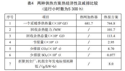 熱網(wǎng)加熱器方案、熱泵+熱網(wǎng)加熱器方案以供熱量、發(fā)電量相同進(jìn)行比較。利用等效熱降理論,通過(guò)對(duì)機(jī)組熱經(jīng)濟(jì)性指標(biāo)的計(jì)算,獲得綜合效益相關(guān)參數(shù),如表4所示。