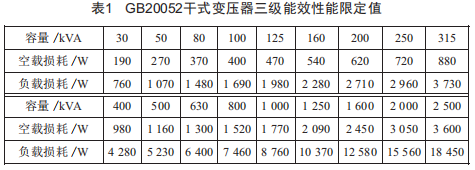 我國(guó)干式變壓器執(zhí)行標(biāo)準(zhǔn)GB1091.11一2017《電力變壓器第11部分:干式變壓器》,除了改動(dòng)一些內(nèi)容以便適應(yīng)中國(guó)國(guó)情,與國(guó)際電工委員會(huì)標(biāo)準(zhǔn)IEC60076-11《電力變壓器第11部分:干式變壓器》基本一致。其中,干式變壓器定義為鐵芯和繞組均不浸于絕緣液體中的變壓器,以示與油浸式變壓器的區(qū)別。干式變壓器所執(zhí)行的能效標(biāo)準(zhǔn)GB20052一2013《三相配電變壓器能效限定值及能效等級(jí)》,要求干式變壓器的空載損耗的負(fù)載損耗不能超出表1中的限定值。