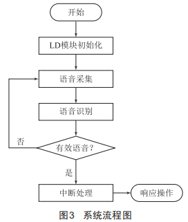 系統(tǒng)軟件主要包括語音識別程序和家電控制程序,語音識別程序主要完成識別模塊的初始化、關鍵詞添加、語音識別和響應中斷,家電控制程序對語音識別命令進行配置,用以調節(jié)亮度、溫度等操作。具體流程如圖3所示。