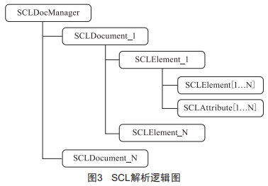 SCL解析庫模塊基于xML流的方式實(shí)現(xiàn)對SCL文件(SCLDocument類)的讀取,并在內(nèi)存中按樹形結(jié)構(gòu)存儲各解析出來的SCL元素(SCLELement類)及其屬性(SCLAttribute類),其結(jié)構(gòu)如圖3所示。
