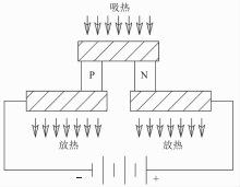 圖1所示為由一塊P型半導體材料和一塊N型半導體材料連接成的電偶,通以直流電后制取冷量的情況。由于P型半導體內載流子(空穴)和N型半導體內載流子(電子)與金屬片中所有的載流子勢能不同,必然會在半導體材料和金屬片的結點上發(fā)生能量傳遞和轉換。因為空穴在P型半導體內具有的勢能高于其他金屬片的勢能,在外電場作用下,當空穴通過結點a時,需要從金屬片中吸取一定的能量,用以提高自身的勢能才能進入P型半導體內,因而a處溫度就會降低,形成冷結點:當空穴通過b結點時,需要將多余部分勢能留給結點,才能進入金屬片中,這時結點b處溫度會升高,形成熱結點。