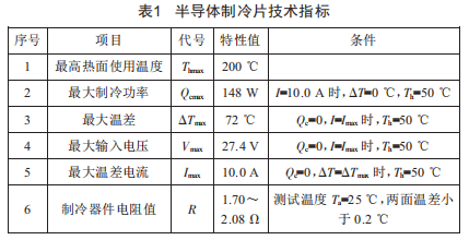 半導體制冷片是半導體制冷器核心元件。根據(jù)系統(tǒng)的制冷功率等技術要求,并參考前期產(chǎn)品的選型以及相關試驗的驗證,現(xiàn)階段公司研制的半導體制冷器選用的半導體制冷片規(guī)格為TE9500/199/100Bs,其詳細技術指標如表1所示。