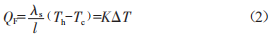 式中,入為導體的導熱系數(shù):s為導體的有效截面積:l為導體的有效長度:Th為熱端絕對溫度:Tc為冷端絕對溫度:K為導體的總熱導:AT為冷熱端溫差。
