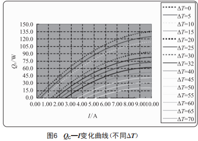 由圖6所示曲線可以看出,在溫差AT確定時,直流電流I(0~Imax=10A)越大,制冷功率QC越大:在I一定時,QC隨AT減少而增大。