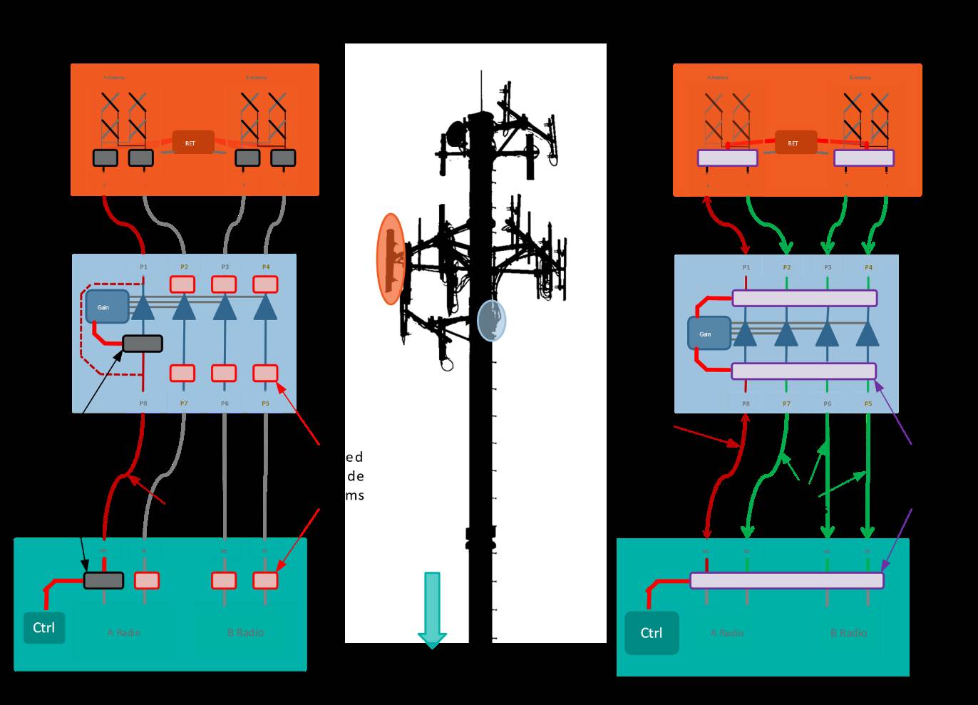 在上述示例中,每對天線保留兩個調(diào)制解調(diào)器,用于保持基站提供商之間的兼容性。不過,塔頂放大器(TMA)上需要七到八個調(diào)制解調(diào)器:四個在連接到天線陣列(上行)的端口上監(jiān)聽,四個在下行端口上用于向基站廣播ping?;拘枰硗獾恼{(diào)制解調(diào)器:一個用于原始AISG信道,另外三個用于從其它端口的TMA接收ping數(shù)據(jù)包。