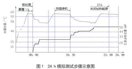 根據(jù)標(biāo)準(zhǔn)中要求的放水量模型,按照圖1所示測試步驟進(jìn)行性能測試,進(jìn)而計(jì)算熱水器年耗量、熱水器年能源消耗量、UEF能效因子、修正后的熱水器日能源消耗量、水箱待機(jī)熱損失系數(shù)、加熱效率等。圖1是以中等用水量為例列出的測試步驟簡圖。