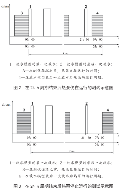 1)有效熱量的計(jì)算。由制造商根據(jù)水箱容量選擇放水循環(huán)模式,放水循環(huán)模式中的每一次放水過程,均應(yīng)完成。當(dāng)位于水箱內(nèi)的熱水溫控器最后一次關(guān)閉熱泵時(shí)立即開始循環(huán)測試。當(dāng)放水循環(huán)時(shí)間在24h以上時(shí),最后一次熱泵關(guān)閉后結(jié)束循環(huán)測試(見圖2)o從測試計(jì)時(shí)開始在達(dá)到24h內(nèi),熱泵若沒有運(yùn)轉(zhuǎn),循環(huán)測試應(yīng)延長至熱泵啟動(dòng)至加熱完成(見圖3)。