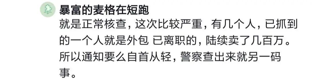 有人說,別想那么多,就是正常核查,這次比較嚴重,有幾個人參與,已經(jīng)抓到的一個是外包人員,陸續(xù)賣了幾百萬。所以電話通知,自首的話從輕處理,等警察查出來就是另一碼事了。