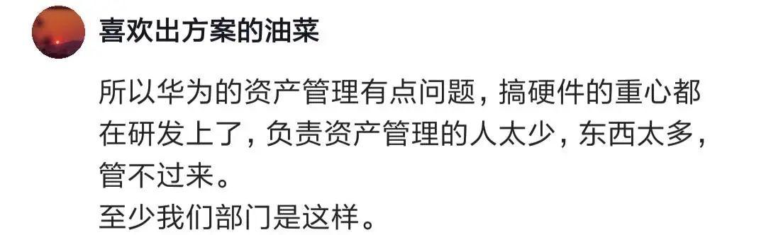 有人說,華為的資產(chǎn)管理有問題,搞硬件的重心都在研發(fā)上,負責資產(chǎn)管理的人太少,東西太多,管不過來。
