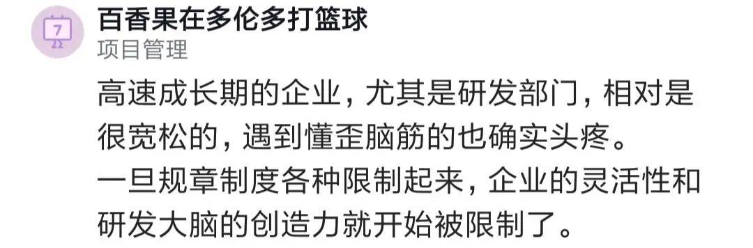 還有人說,高速成長期的企業(yè)是很寬松的,一旦規(guī)章制度限制起來,企業(yè)的靈活性和研發(fā)大腦的創(chuàng)造力就被限制了。