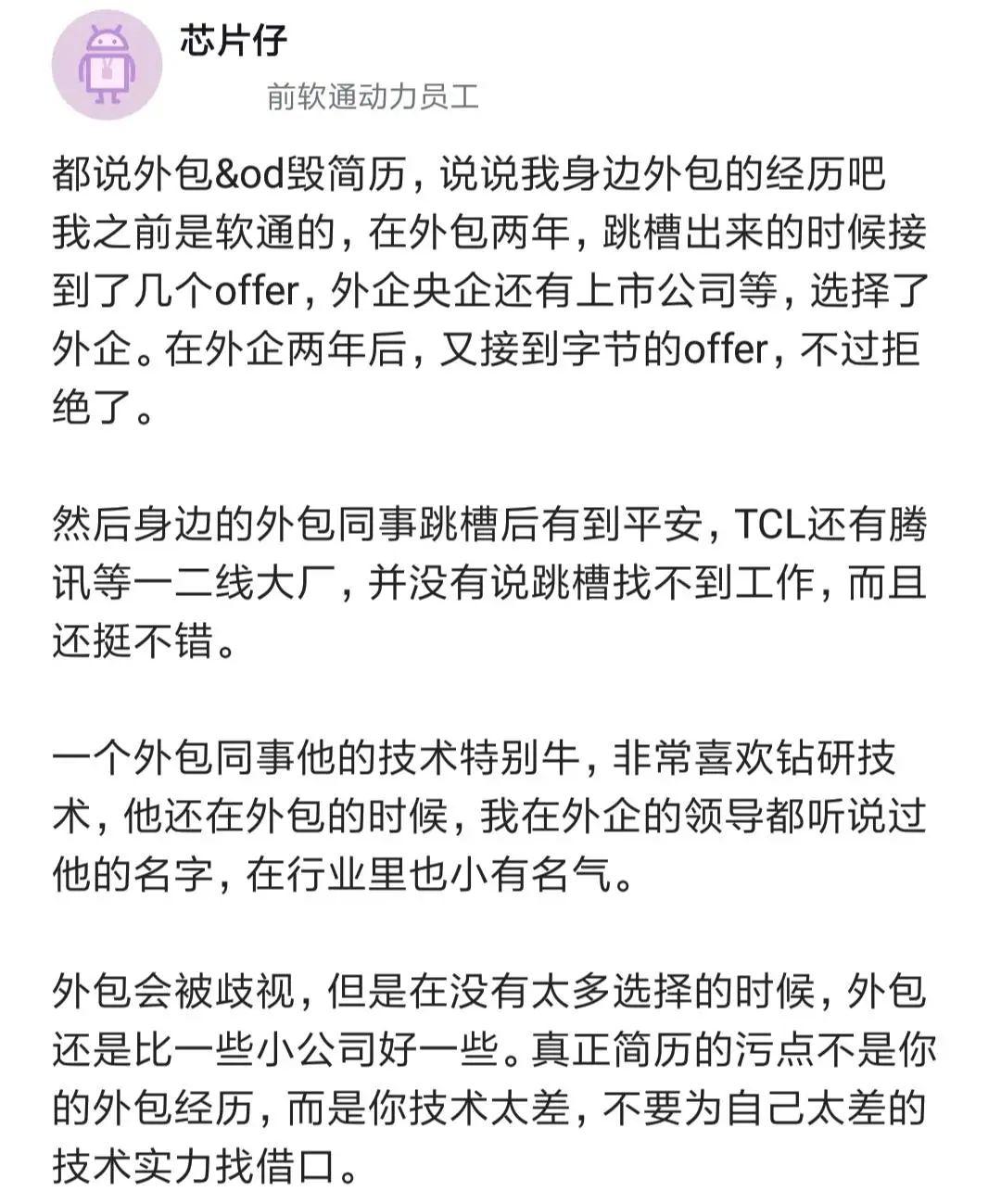 都說外包毀簡歷,事實是否如此呢?一位網(wǎng)友分享了自己和身邊外包員工的經(jīng)歷:他之前是軟通的,外包兩年,跳槽出來接到過外企、央企和上市公司的offer,選擇了外企,在外企兩年后,又接到字節(jié)的offer,不過拒絕了。身邊的外包同事有的跳槽到平安,有的跳到TCL和騰訊等大廠。一個外包同事技術(shù)特別牛,在行業(yè)里都小有名氣。樓主說,外包雖然會被歧視,但在沒有太多選擇的時候,外包比小公司好。真正的簡歷污點不是外包經(jīng)歷,而是你技術(shù)特別差!