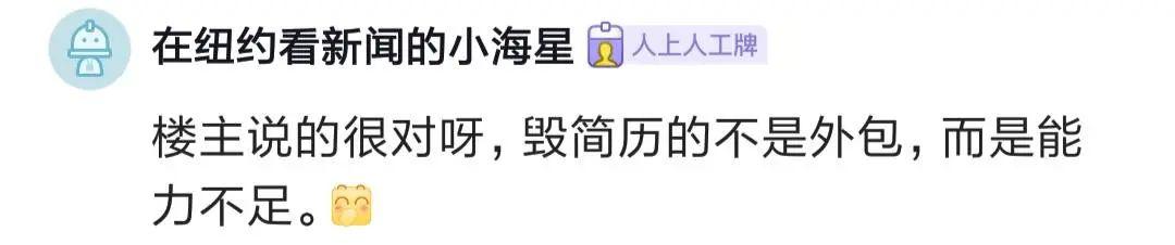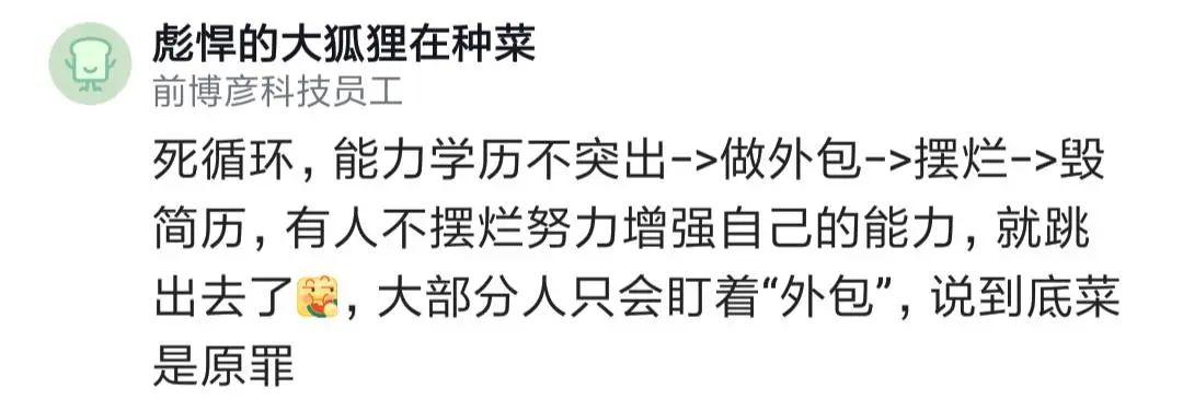 網(wǎng)友說,外包因為起點低,學習能力差,韌性低,所以能往上的沒幾個,不能怪這個崗位,是人本身不行。