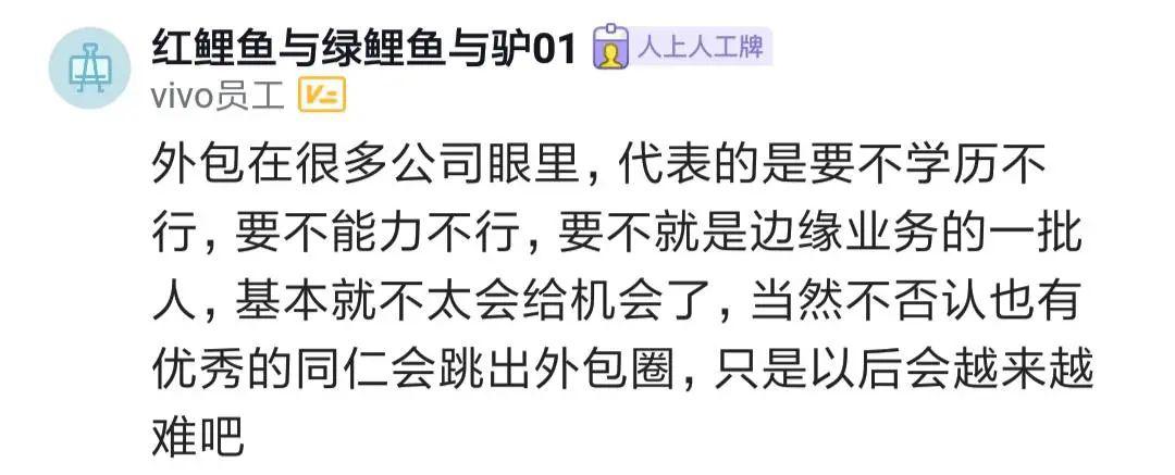 還有人說,外包在很多人眼里代表的要不是學歷不行,要不是能力不行,要不是邊緣業(yè)務(wù)的人,基本不太會給機會了,現(xiàn)在hr看到外包,連簡歷那一關(guān)都過不了。