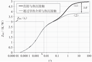 將器件直接與熱沉接觸以及將器件通過導(dǎo)熱硅膠與熱沉接觸,按照上述步驟得到兩條對應(yīng)的瞬態(tài)熱阻抗曲線。對同一器件來說,其內(nèi)部熱量傳遞路徑是一樣的,不隨散熱條件的變化而變化,因此熱阻抗曲線也是一樣的。當(dāng)熱量傳遞到封裝表面以后,在不同散熱環(huán)境中的散熱路徑也不同,從而使得熱阻抗曲線發(fā)生變化。因此,兩條熱阻抗曲線的重合部分對應(yīng)的就是熱量在器件內(nèi)部傳遞路徑的熱阻,兩者的分離點對應(yīng)的熱阻就是結(jié)殼熱阻。
