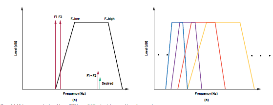 圖2.(a)亞倍頻程預(yù)選可減輕IMD2問(wèn)題;(b)濾波器頻帶隨著頻率的增加而變寬