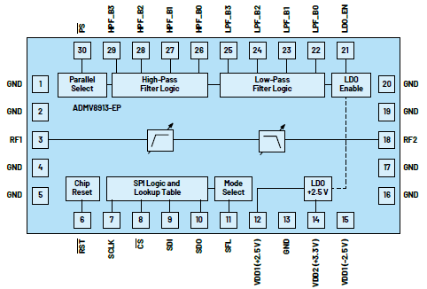 ADMV8913是高通和低通濾波器的組合,采用6mm × 3mm封裝,它專門(mén)設(shè)計(jì)用于在8Ghz至12GHz的頻率范圍(X波段)內(nèi)工作,插入損耗低至5dB。高通和低通濾波器都可以用16種狀態(tài)(4個(gè)控制位)進(jìn)行調(diào)諧,以調(diào)整3dB頻率(f3 dB)。此外,ADMV8913集成了一個(gè)并行邏輯接口,可以在不需要SPI通信的情況下設(shè)置濾波器狀態(tài)。這種并行邏輯接口對(duì)于需要快速濾波器響應(yīng)時(shí)間的系統(tǒng)來(lái)說(shuō)相當(dāng)有用,因?yàn)樗薙PI處理所需的時(shí)間。圖14所示為ADMV8913的功能框圖。