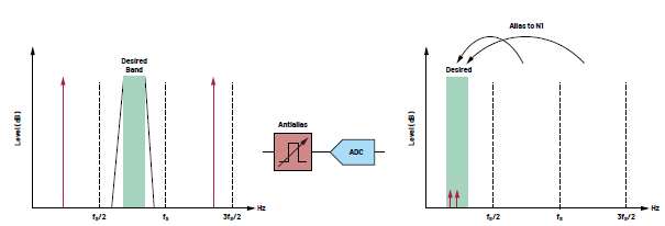 圖5.如果沒(méi)有足夠的抑制,ADC中的混疊會(huì)導(dǎo)致干擾信號(hào)出現(xiàn)在某個(gè)頻段