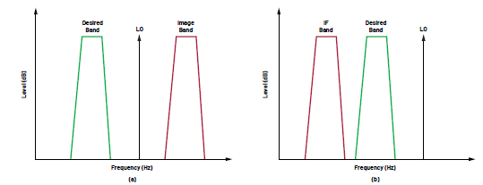 圖3.(a)必須在混頻器之前抑制的鏡像頻段和(b)中頻頻段