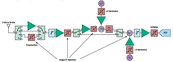 圖1顯示了覆蓋2GHz至18GHz的典型寬帶信號(hào)鏈。該信號(hào)鏈的基本工作原理如下:天線接收的頻率范圍很廣,將頻率轉(zhuǎn)換為ADC能夠進(jìn)行數(shù)字化處理的中頻信號(hào)之前,需要進(jìn)行一系列放大、濾波和衰減控制(射頻前端)。此框圖中的濾波功能可分為四大類:
