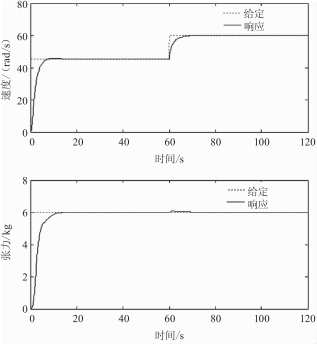 由以上仿真波形可以看出,兩電機(jī)神經(jīng)網(wǎng)絡(luò)逆控制方法能夠很好地實(shí)現(xiàn)線性化解耦,無(wú)論是速度突變還是張力突變,都可以很好地保持系統(tǒng)相對(duì)穩(wěn)定,但兩電機(jī)神經(jīng)網(wǎng)絡(luò)開環(huán)控制會(huì)存在一些穩(wěn)態(tài)誤差,當(dāng)引入模糊PID閉環(huán)控制時(shí),穩(wěn)態(tài)誤差消除,兩電機(jī)神經(jīng)網(wǎng)絡(luò)逆模糊PID控制體現(xiàn)出了很好的動(dòng)態(tài)響應(yīng)特性及魯棒性。