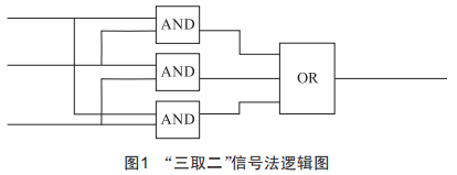 "三取二"是指開(kāi)關(guān)量控制時(shí)的投票制,同一信號(hào)采用三冗余信號(hào)進(jìn)行表決,兩個(gè)滿足即認(rèn)為條件滿足。"三取二"是為了判斷準(zhǔn)確、可靠,防止誤動(dòng),常用于保護(hù)回路。其邏輯圖如圖1所示。