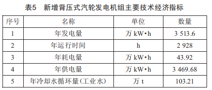本次改造一方面提高了蒸汽供應(yīng)能力,填補(bǔ)了廠區(qū)采暖季蒸汽的缺口,同時(shí)還提高了高效燃?xì)庹羝?lián)合循環(huán)發(fā)電機(jī)組的能源利用率:另一方面,可以利用余熱發(fā)電,滿(mǎn)足廠區(qū)的用電需求,并降低了環(huán)保風(fēng)險(xiǎn),能源得以高效梯級(jí)綜合利用,實(shí)現(xiàn)了綜合能效提升。新增背壓式汽輪發(fā)電機(jī)組主要技術(shù)經(jīng)濟(jì)指標(biāo)如表5所示。