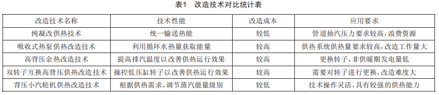 當(dāng)前,供熱改造工程技術(shù)種類(lèi)眾多,應(yīng)選取適合公司現(xiàn)有條件且改造成本較低的改造方案。本文對(duì)比了5種較為成熟的改造方案,對(duì)其技術(shù)性能、成本和應(yīng)用要求分別進(jìn)行分析,如表1所示。