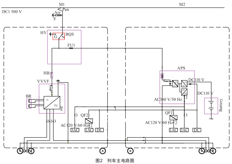 輔助電源系統(tǒng)的運行獨立于列車牽引系統(tǒng),其主要設備為輔助電源箱(含輔助逆變器和低壓電源),采用強迫風冷的方式,車輛控制系統(tǒng)采用DC110V電源,交流電源采用AC380V。在M2車安裝有一個輔助電源箱和一個蓄電池箱。蓄電池采用鎘鎳堿性蓄電池組,在輔助電源系統(tǒng)關閉的情況下,蓄電池能應急供電1.5h。