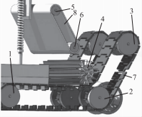 1、2、3一大驅(qū)動(dòng)輪:4一類(lèi)齒輪:5、6一小驅(qū)動(dòng)輪:7一履帶:8一皮帶。
