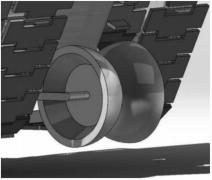 履帶部分實(shí)現(xiàn)行進(jìn)與草料鋪設(shè)功能。工作時(shí),大驅(qū)動(dòng)輪1~3驅(qū)動(dòng)履帶7運(yùn)動(dòng),履帶7下表面接觸地面,推動(dòng)整個(gè)機(jī)構(gòu)向前運(yùn)動(dòng):同時(shí)履帶7上表面接觸貨倉(cāng)中的草料,將草料帶向貨倉(cāng)下方的出料口,進(jìn)而使草料平鋪在下部的水平履帶部分,等待插刀下插。小驅(qū)動(dòng)輪5、6帶動(dòng)皮帶8運(yùn)動(dòng),有上行與下行兩種運(yùn)動(dòng)模式,取決于貨倉(cāng)內(nèi)草料的密度和濕度:當(dāng)草料密度較低時(shí)下行,與履帶7共同將草料向下方帶動(dòng),保證出料量:當(dāng)草料密度較高時(shí)上行,將貨倉(cāng)底部的部分草料翻至上層,避免底部草料密度過(guò)大堵塞出料口。類(lèi)齒輪4位于貨倉(cāng)出料口處,隨履帶7運(yùn)動(dòng)而轉(zhuǎn)動(dòng),并在轉(zhuǎn)動(dòng)的同時(shí)將輪齒插入下方履帶上的草料中,將草料分成小堆,保證出料通暢、均勻。