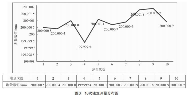 (3)為滿足測量要求,需要對A類不確定度進(jìn)行評估,采用激光干涉儀對選定的被校工作用玻璃線紋尺的200mm度值刻度進(jìn)行10次獨立的測量,并得到測量結(jié)果(圖3),根據(jù)貝塞爾公式計算可得重復(fù)性試驗標(biāo)準(zhǔn)差為0.71μm。