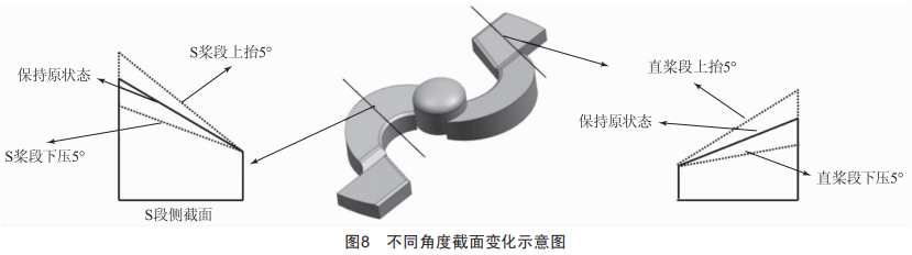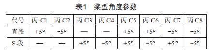在S型混合獎的基礎(chǔ)上,分析直獎段、S獎段不同角度值下的攪拌性能參數(shù)和流場分布情況,獎葉兩部分傾角示意圖如圖8所示,各獎在已有模型的基礎(chǔ)上對直獎段及S獎段型傾角進(jìn)行調(diào)整,如表1所示。