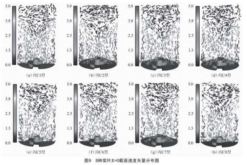 圖9為各獎葉在xs2截面處速度矢量圖,從軸向、徑向、切向速度的變化趨勢分析兩段獎葉的傾斜角度對攪拌流場的影響: