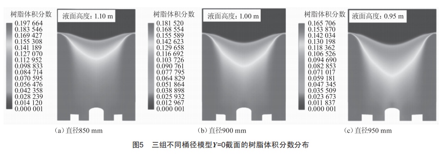 隨著攪拌時間的推進(jìn),樹脂在三種攪拌器中的變化趨勢相近:由于攪拌導(dǎo)致空氣的混入,樹脂的體積分?jǐn)?shù)有一定減小。從圖5中樹脂在料液中的體積分?jǐn)?shù)變化可知,6個監(jiān)測點樹脂占料液的體積分?jǐn)?shù)變化上限和下限的差別為0.02%左右,可見樹脂在料液中的均勻性沒有隨著料液加入水泥后整體物性的變化而受到過多影響,不同位置的體積分?jǐn)?shù)相差不大,樹脂還是均勻分布在料液之中。隨著攪拌桶直徑的增大,模型的自由液面逐漸降低。