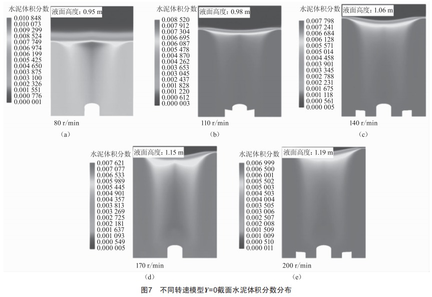 結(jié)果表明,轉(zhuǎn)速越大,攪拌越能快速趨近均勻狀態(tài):攪拌7ms后,9個監(jiān)測點的水泥體積分?jǐn)?shù)趨近:轉(zhuǎn)速增加有助于攪混效率的提高,但轉(zhuǎn)速較高時(172r/0in、022r/0in),液面位置較高(分別達(dá)到1.1m0和1.190),容易造成飛濺。綜合考慮攪拌混合均勻性、攪拌液面高度等因素,攪拌獎轉(zhuǎn)速在142~1m2r/0in可較好地匹配下料與攪拌,且不會造成攪拌過程的飛濺。