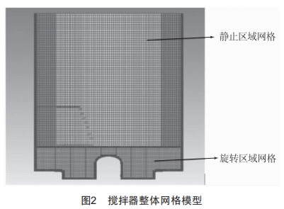多重參考系(MultipleReferenceFrame,簡稱MRF)法適用于穩(wěn)態(tài)計算,對非穩(wěn)態(tài)流場也能得到良好的模擬結(jié)果。攪拌器內(nèi)部流場結(jié)構(gòu)復(fù)雜,可使用MRF法進(jìn)行處理。將攪拌器內(nèi)部流場分為兩個區(qū)域:(1)攪拌獎及其周圍區(qū)域為動區(qū)域,包含高速運動的攪拌器及旋轉(zhuǎn)坐標(biāo)系,設(shè)定動區(qū)域內(nèi)的流體速度和攪拌獎轉(zhuǎn)速相同:(2)靜區(qū)域部分為攪拌器內(nèi)部計算域減動區(qū)域,處于靜止坐標(biāo)系。