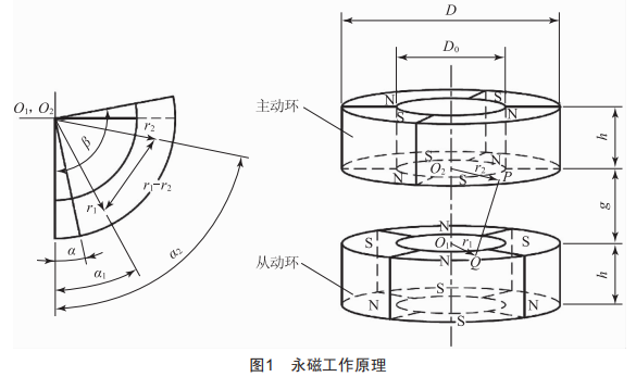 圖1中P點為主動磁環(huán)下表面任意選取一點:Q點為從動磁環(huán)上表面任意選取一點:D為磁環(huán)外徑:D0為磁環(huán)內(nèi)徑:r1為O點半徑:r2為P點半徑:r1-r2為0點至P點的向徑:g為主動環(huán)與從動環(huán)之間的磁隙:h為磁環(huán)厚度: