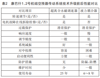 為更好地分析超離合永磁調(diào)速器在空預器傳動裝置中的作用,現(xiàn)對康巴什電廠空預器主電機傳動系統(tǒng)改造前后各項性能進行對比,如表2所示。
