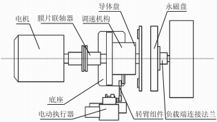(2)超離合永磁調(diào)速器結(jié)構如圖2所示,主要由五部分組成:連接法蘭、永磁盤、導體盤(銅或鋁)、轉(zhuǎn)臂組件、調(diào)速機構。永磁盤鑲有永磁體(強力稀土磁鐵),通過連接法蘭與負載軸連接。導體盤與調(diào)速機構連接,電機通過膜片聯(lián)軸器與調(diào)速機構相連從而帶動導體盤轉(zhuǎn)動。當氣隙需要調(diào)整時,電動執(zhí)行器帶動轉(zhuǎn)臂組件,轉(zhuǎn)臂組件帶動調(diào)速機構外筒旋轉(zhuǎn),外筒旋轉(zhuǎn)通過調(diào)速機構內(nèi)螺旋槽轉(zhuǎn)化為直線運動,使導體盤軸向滑動。負載轉(zhuǎn)速隨著氣隙的逐漸增大而減小,當氣隙到達一定程度時,負載轉(zhuǎn)速降為0。另外,還有支座用于支撐永磁本體,避免電機軸與負載軸承載附加力。連接法蘭用于連接固定磁盤與減速機負載軸。