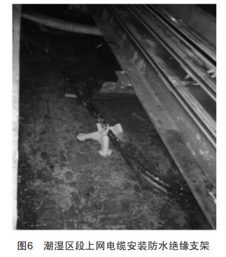 受道床潮濕、積水影響,潮濕區(qū)段上網(wǎng)電纜金屬套管受潮銹蝕,水汽侵入套管內(nèi),加劇了線纜受潮風(fēng)險(xiǎn)。在對(duì)受潮銹蝕嚴(yán)重的電纜套管進(jìn)行拆除時(shí),通過技術(shù)創(chuàng)新,在電纜敷設(shè)路徑上安裝了防水絕緣支架將電纜墊高(圖6),以減少電纜受潮風(fēng)險(xiǎn)。