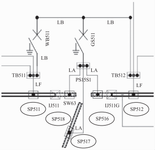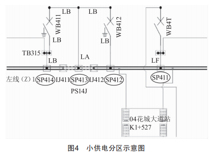 小供電分區(qū)(圖4中虛線PS14J區(qū))位于每個(gè)車站的出站位置(出站約40m位置),其設(shè)計(jì)初衷為施工作業(yè)時(shí)可靈活停電,減小停電檢修時(shí)的影響范圍。小供電分區(qū)沒有上級(jí)電源,主要依靠閉合與鄰區(qū)相連的軌旁開關(guān),由鄰區(qū)為小供電區(qū)供電。小供電區(qū)只有一組上網(wǎng)電纜(LA代表一個(gè)上網(wǎng)點(diǎn)),當(dāng)該組上網(wǎng)電纜出現(xiàn)絕緣故障時(shí),搶修人員必須下線路將上網(wǎng)電纜甩開,還需要在鄰區(qū)接觸軌絕緣節(jié)(圖4中IJ412或IJ411位置)上安裝中間連接板,通過與鄰區(qū)硬線連接并區(qū)的方式恢復(fù)供電。