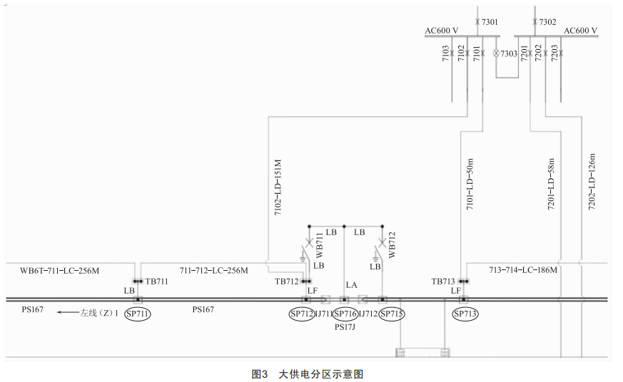 大供電分區(qū)(以圖3中PS167區(qū)為例)一般從區(qū)間開始到站臺(tái)位置結(jié)束(越過站臺(tái)約40m),這類供電大區(qū)有一個(gè)上級(jí)電源(圖3中7102饋線開關(guān)),另外與鄰區(qū)通過合上軌旁開關(guān)進(jìn)行越區(qū)供電:在供電區(qū)中有3個(gè)集中上網(wǎng)的位置,分別為上級(jí)電源上網(wǎng)位置(4組上網(wǎng)電纜)、區(qū)間上網(wǎng)位置(3組上網(wǎng)電纜)以及供電區(qū)末端的上網(wǎng)位置(4組或3組電纜)。此類供電區(qū)經(jīng)測(cè)算得出,只需保留7組上網(wǎng)電纜即可滿足供電需求,計(jì)劃通過撤除區(qū)間上網(wǎng)位置3組上網(wǎng)電纜以及末端上網(wǎng)位置1組上網(wǎng)電纜,對(duì)區(qū)間電纜進(jìn)行核減改造,經(jīng)統(tǒng)計(jì)共可撤除上網(wǎng)點(diǎn)48處(144根電纜)。