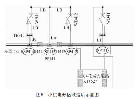 目前APM線接觸軌檢修時(shí)的停、送電模式已基本固定,大部分小供電分區(qū)已失去其設(shè)計(jì)時(shí)的作用,其存在的供電安全隱患遠(yuǎn)比作用要大,所以對(duì)小供電分區(qū)進(jìn)行改造,將小供電分區(qū)通過換軌方式并入靠近站臺(tái)一側(cè)的大供電分區(qū)(圖5),杜絕小供電分區(qū)上網(wǎng)電纜故障導(dǎo)致供電區(qū)失電搶修耗時(shí)長(zhǎng)的隱患。改造后可減少小供電分區(qū)14個(gè),減少上網(wǎng)電纜14處(42根電纜)。