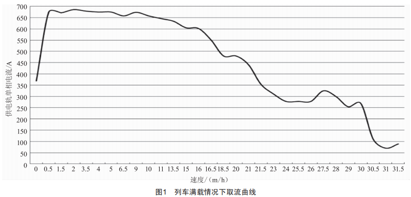 圖1為目前線上2節(jié)車廂列車高峰期滿載運(yùn)行時(shí)的取流曲線,分析取流曲線可知,列車出站加速時(shí),整車取流達(dá)到峰值,峰值相電流為686A,按照+10+的條件(686A+68.6A)規(guī)定本次測(cè)算時(shí)2節(jié)車廂取流最大值為%54.6A。