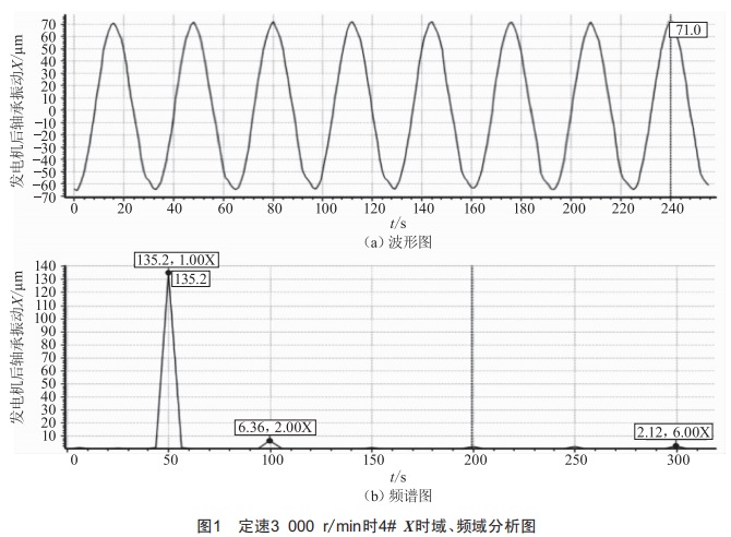 (1)采集初始振動數(shù)據(jù)。分別對3#軸瓦(發(fā)電機驅(qū)動側(cè))和4#軸瓦(發(fā)電機勵磁側(cè))x/Y方向四個通道的振動信息進行采集。啟動機組,定速3000r/min后測得軸承振動情況,如表3所示。