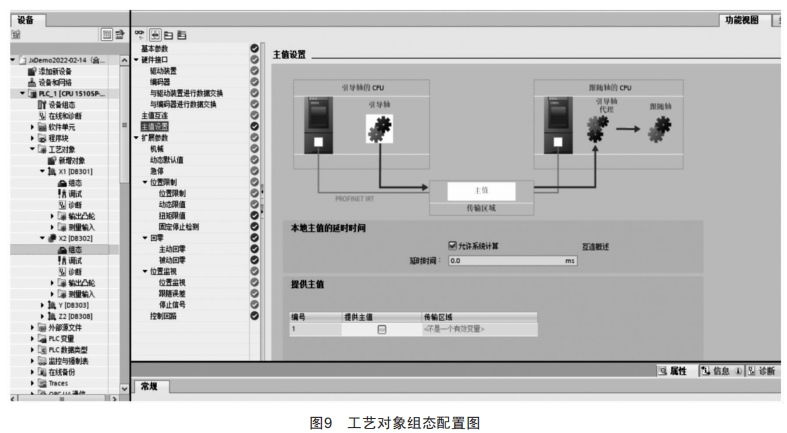 另外一個關(guān)鍵點就是水平方向雙電機之間的同步問題,能否絕對同步關(guān)系到控制方案的成敗,通過工藝對象設(shè)置與關(guān)聯(lián),實現(xiàn)水平軸X1和X2軸的一致同步性。由于外部各種因素,兩軸之間需要調(diào)節(jié)各種相關(guān)參數(shù),如工藝軸方向、傳動比、測量比例、增量間距比例、主從互聯(lián)、加減速等。在調(diào)試過程中會遇到不少問題,如設(shè)計不當會引起振蕩、兩軸不同步、過流過沖、故障率高等,為此需要通過不斷測試,優(yōu)化各項參數(shù)配合,以達到最優(yōu)效果。工藝對象組態(tài)配置圖如圖9所示。
