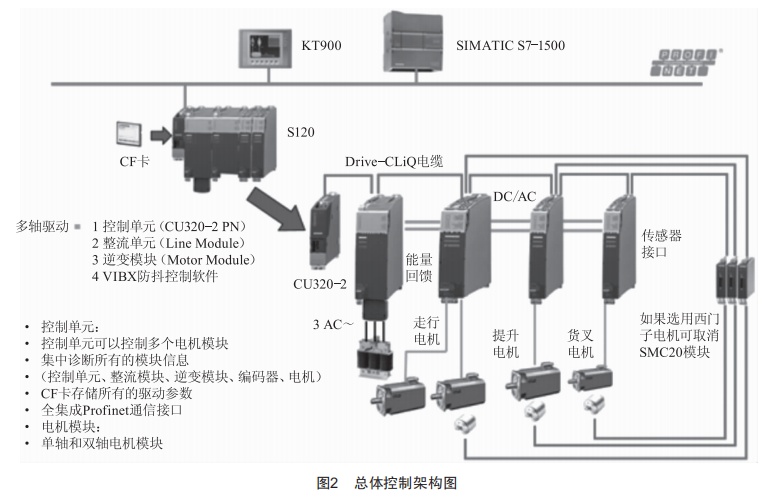 電氣控制方面,由伺服驅(qū)動控制器、s7-1500PLC、PN/ssI激光測距器、觸摸屏HMI、外圍光電傳感器、編碼器等組成PN網(wǎng)絡(luò)。為了實現(xiàn)高速運行中驅(qū)動摩擦力的增大,水平運行x軸采用雙軸伺服雙電機驅(qū)動,垂直升降Y軸采用齒形帶單軸驅(qū)動,貨叉Z軸采用單軸驅(qū)動,并通過EPOS定位功能、雙閉環(huán)控制實現(xiàn)快速精準定位??傮w控制架構(gòu)圖如圖2所示。